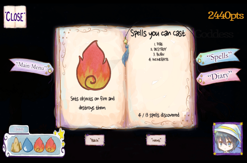 Due to the limitless nature of speech as a controller, it naturally bolstered a player’s curiosity to see what kind of spells they could and couldn’t cast. This curiosity also served as a motivational drive since it encouraged players to explore our levels to experiment with different spells in different situations. On the other hand, this also meant the game wasn’t intuitive which is why the team and I decided to utilize elemental-based magic. Elemental magic is a familiar staple in many fantasy games with very intuitive applications. To add some variety, we also added some non-elemental spells with similar intuitiveness (ex. growing and shrinking spells). Additionally, we also incorporated a spell book menu to act as a visual reminder of the player’s discovered spells (as shown in the picture).