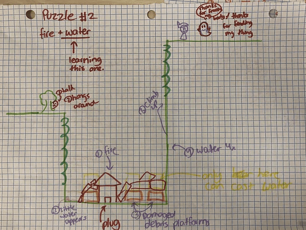 When it came to level and puzzle design, the key goal was to provide a mixture of straight forward and open ended challenges. The decision was made to populate the early portion of the game with straight forward puzzles to introduce the various spells as early as possible. For example, the first level was designed almost exclusively to introduce movement mechanics and the most basic of spells (as shown in the video). Meanwhile, the later portion would contain more open ended puzzles to test the player’s creativity and problem-solving skills. For example, the diagram and screenshot show a puzzle that can be solved using a combination of fire, water, and movement commands. To our pleasant surprise however, some players discovered alternative solutions using earth and growth spells instead.